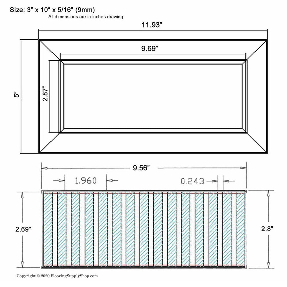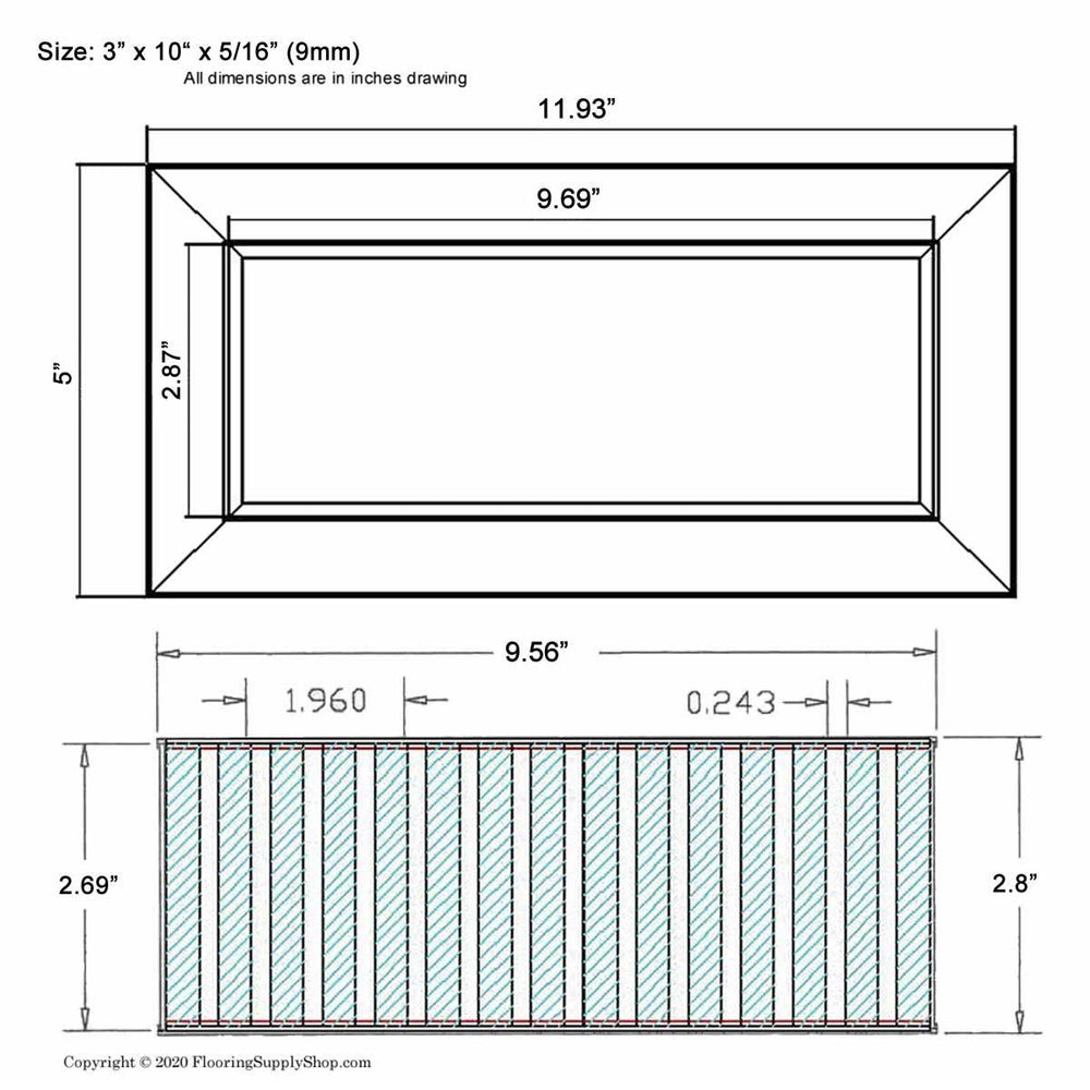 This register is designed to fit a 3" x 10" floor opening and the overall outside dimensions are 5" x 12"