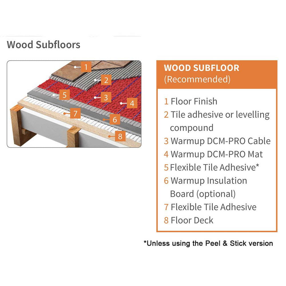 The DCM-PRO Peel-and-Stick Membrane can be installed directly over a clean plywood or concrete subfloor without thinset. For OSB subfloors or other uneven subfloors, a primer may be required to improve bonding. Always follow installation instructions and shop-vac/wet-mop the subfloor for effective bonding. The Warmup DCM-PRO Cable can be installed at 2, 3 or 4 pegs to achieve the desired heat output. See following chart.