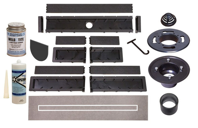 1 Insert Removal Tool, 1 disposable 1/16" Square Notched Trowel, 1 GPLDC-69"x15" Linear Drain Collar , 1 GPS-2000 Multipurpose Sealant Cartridge and 1 GPMPSC 4 oz. can PVC/ABS Pipe Glue