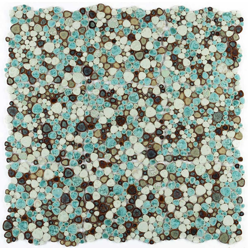 Multi Green & Beige Pebble Shape Handmade Porcelain Mosaic.