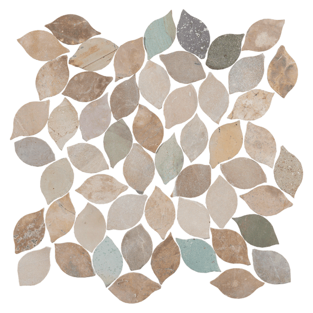 This Olive marble leaves mosaic tile comes on a mesh backing for easy installation. It is perfect for creating decorative features, accent walls, or cutting down for use as borders and backsplashes.