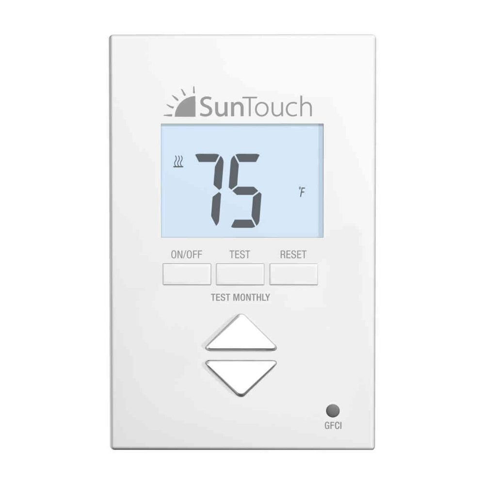 SunStat® Core is a non-programmable thermostat designed to operate SunTouch® electric floor heating systems. The temperature of the floor can easily be set with an up or down button to a desired setpoint. A backlit display with large font makes it easy to read the temperature of the floor. SunStats include a floor sensor, built-in relay and GFCI to safely control 120 or 240 VAC electric floor heating systems.