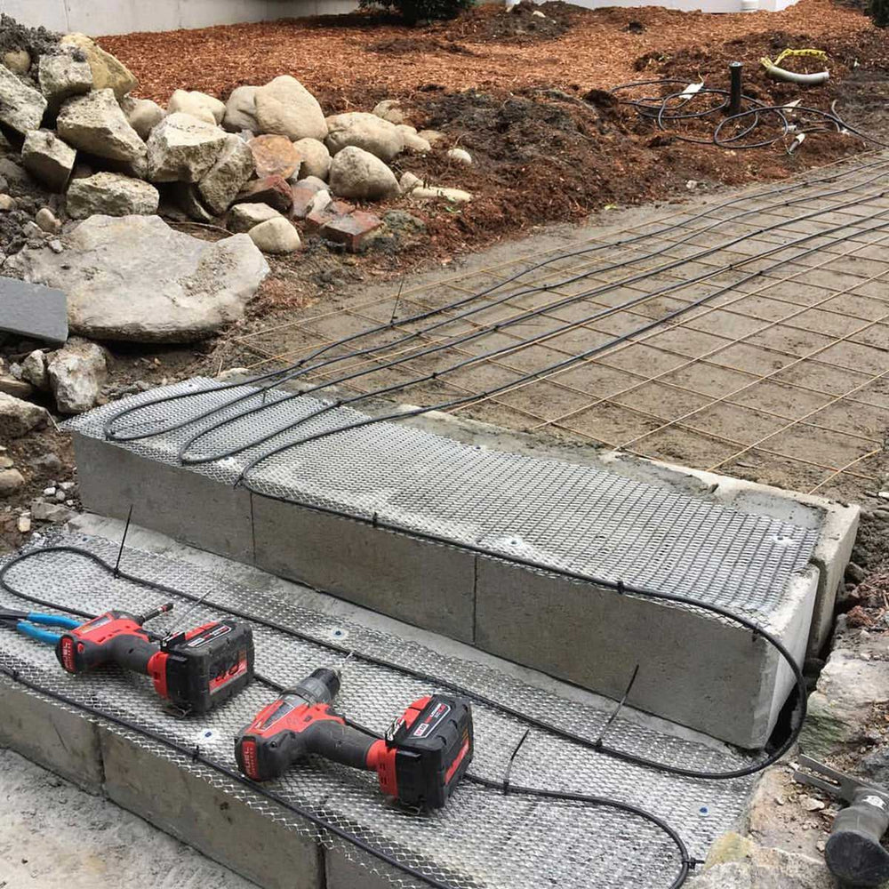 Installation under CONCRETE - Ensure the pour is 4" maximum over the cable. Use re-mesh or wire mesh to secure the cable in the middle of the pour for deeper pours. Cable/Mats can be zip tied to mesh and mesh can be raised with bricks or pulled during pour.