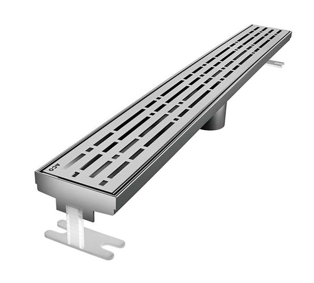 A “Mix” and mingle of interchangeable rectangles and squares add interest to this shower drain. This grate can be incorporated into a variety of tiles and colors to complete any look. ACO’s Brushed Stainless finish captures a classic ‘brush-stoke’ texture that pairs well with almost anything, especially Brushed Nickel and most silver-toned metals and hardware.