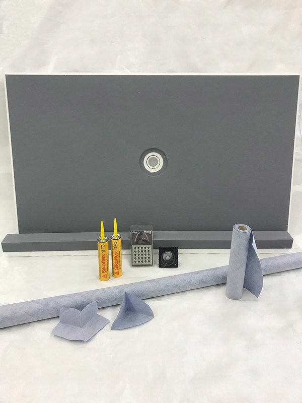 ProPan ready-to-tile shower base with integrated drain assembly, curb, WaterArmor® bonded sheet waterproofing membrane, banding tape & inside/outside corners, Sikaflex® 11 FC polyurethane and