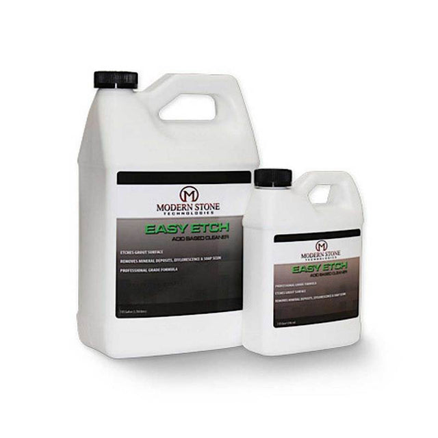Modern Stone's Easy Etch removes grout and mortar smears, mineral deposits and rust stains. This industrial strength concentrated acid based cleaner is specially formulated to etch grout to bond with Modern Stone's Color Sealer. Use on acid-resistant tile, stone or masonry surfaces.