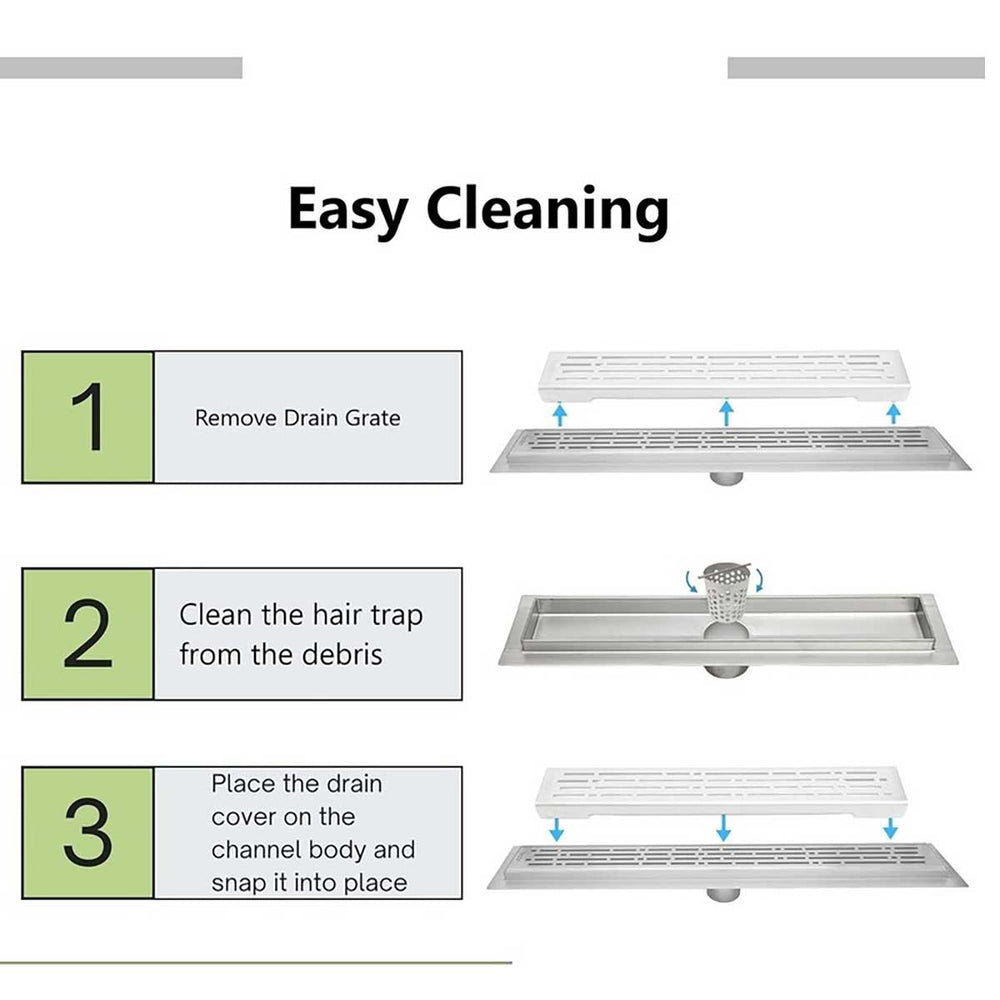 Easy Cleaning: Simply open the drain grate, remove the SereneDrains Hair Trap, clean it, put it back in the outlet and place the grate back.