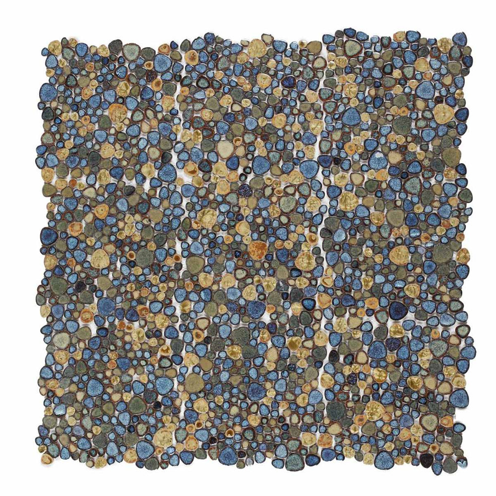 Heart Shaped Porcelain Mosaic with Cream, Olive, Blue, and Dark Yellow Pebble-Like Colors