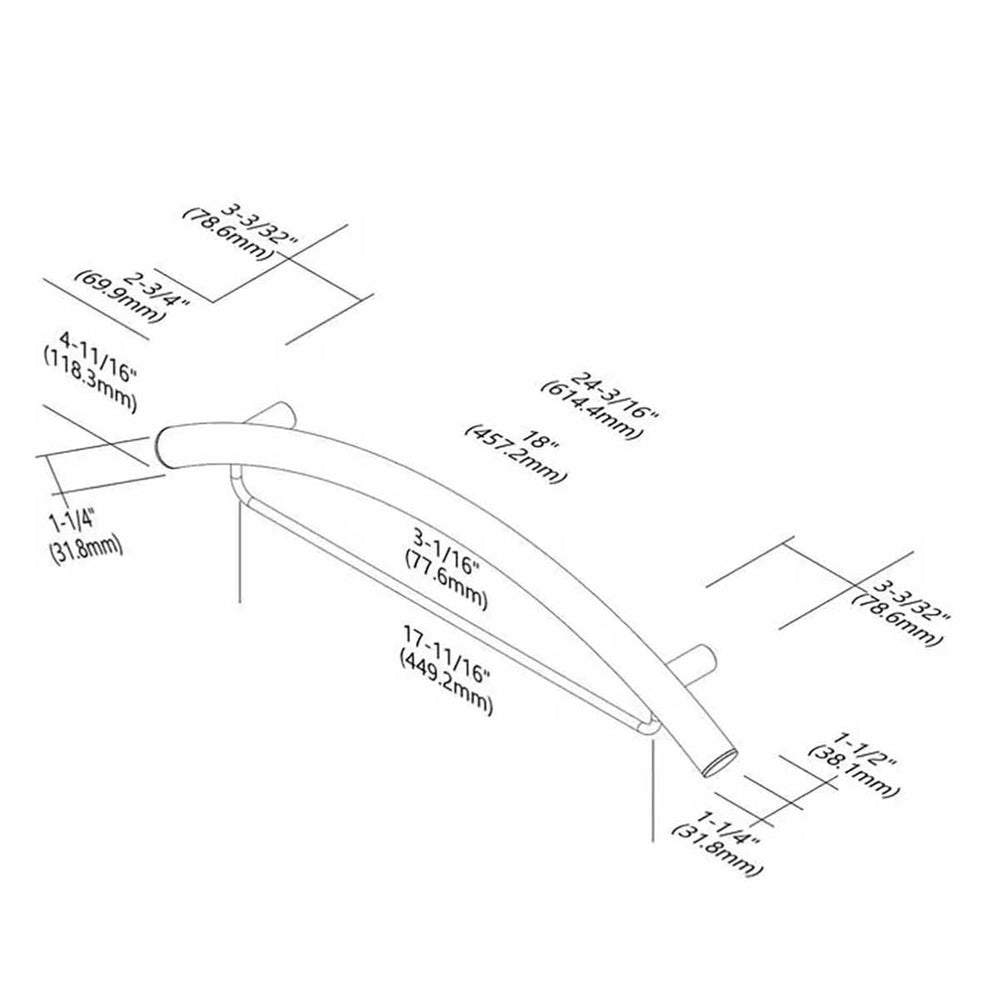 Dimensions 24 3/16" length x 1 1/4" OD tube x 1 1/2" depth(from tile wall to inside edge of bar) with mounting posts 18" center-to-center