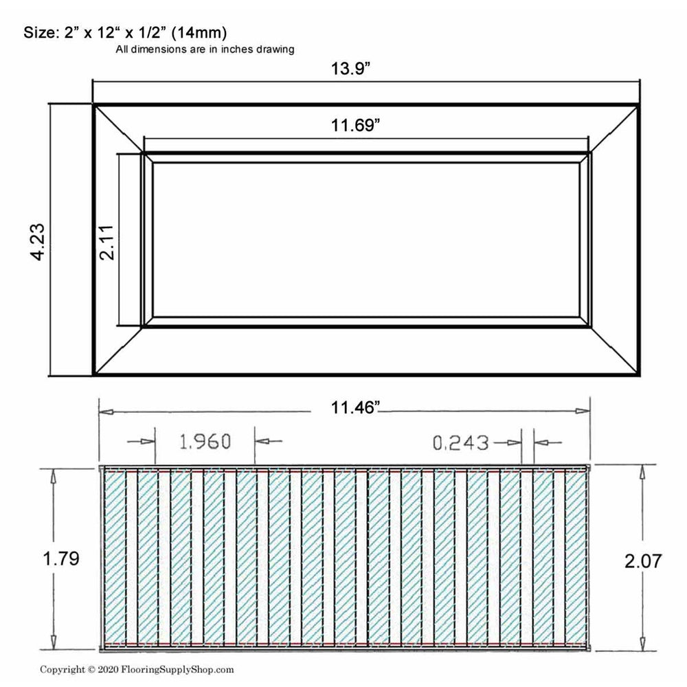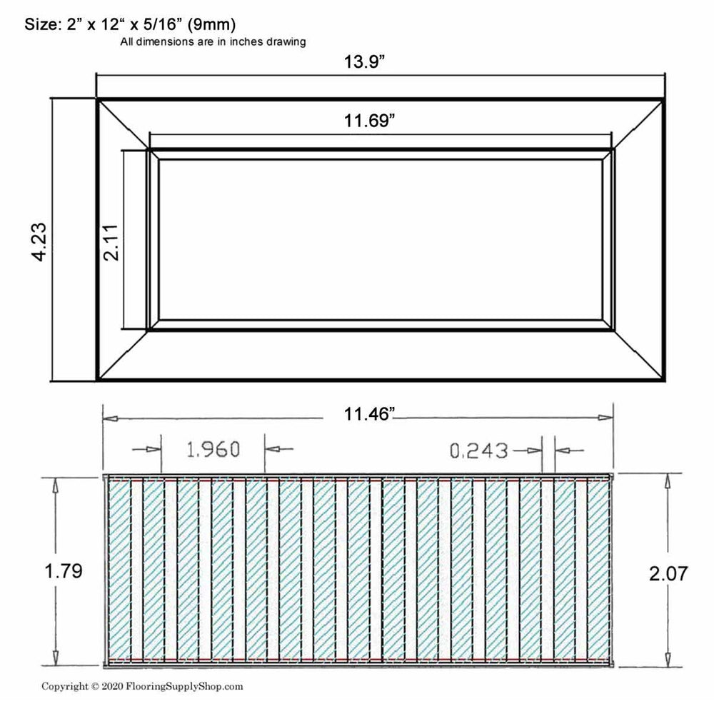 This register is designed to fit a 2.25" x 12" floor opening and the overall outside dimensions are 4.25" x 14"