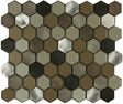 The metals are 100% aluminum. The aluminum copper and bronze colors are produced by a staining process. Each piece of metal has an ‘etched’ surface finish and depending on the color, the etching is more prominent on certain colors than others. For example, the etching is more noticeable on the lighter colored metals than the darker. Within the aluminum mosaic blend, there are random inserts of 1x1 glass mosaics. The glass mosaic edges are capped with bronze polished framed pieces to add a unique and contemporary look to the Victoria Metals. The bronze pieces are produced by an anodizing process. During installation, excess grout between the metal caps and glass pieces can be removed with either a soft toothbrush or toothpick.