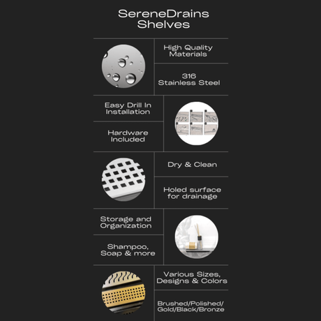 SereneDrains Shower Shelf Stainless Steel - Traditional Square - Brushed
