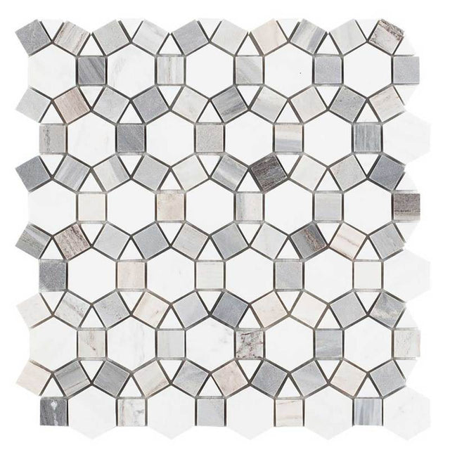 White Carrara Mixed with Blue Dalessandro Marble in Circular Shape. This Mosaic comes in a Honed finish.